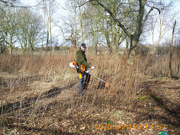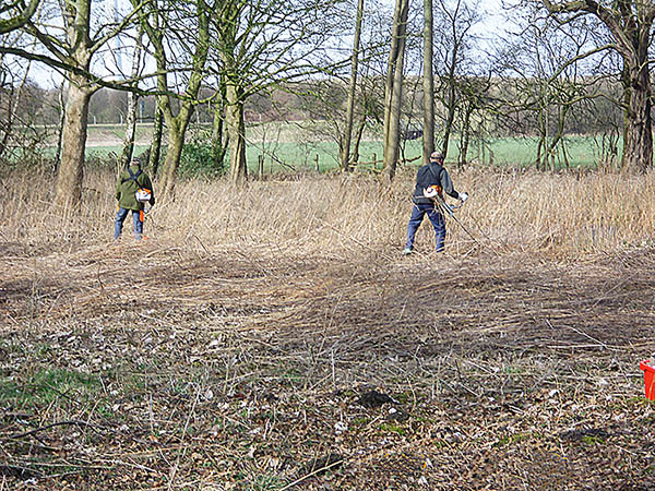 Nach einem gemeinsamen Gruppenfoto wurden die einzelnen Gruppen eingeteilt. Die Gruppen wurden mit Handschuhen und Müllgreifern sowie Abfallsäcken ausgestattet. Nun ging es los! Die Einen sammelten den Müll aus den Gräben, während die Anderen im Biotop wieder "rein Schiff" machten. Hier wurde die Hecke und die Kopfweiden eingekürzt sowie die Biotopfläche kurz geschnitten.